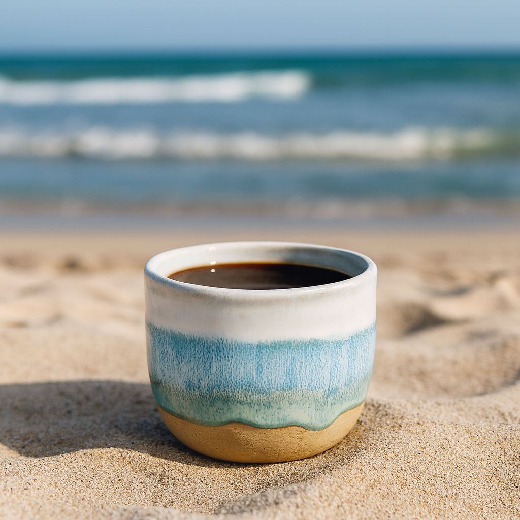 Denne lille kop er håndlavet i stentøj og glaseret med inspiration fra havet og kystens farver. Det blågrønne farvespil leder tankerne mod strand, vand og himmel, mens den rå bund giver et naturligt modspil til den blanke overflade.