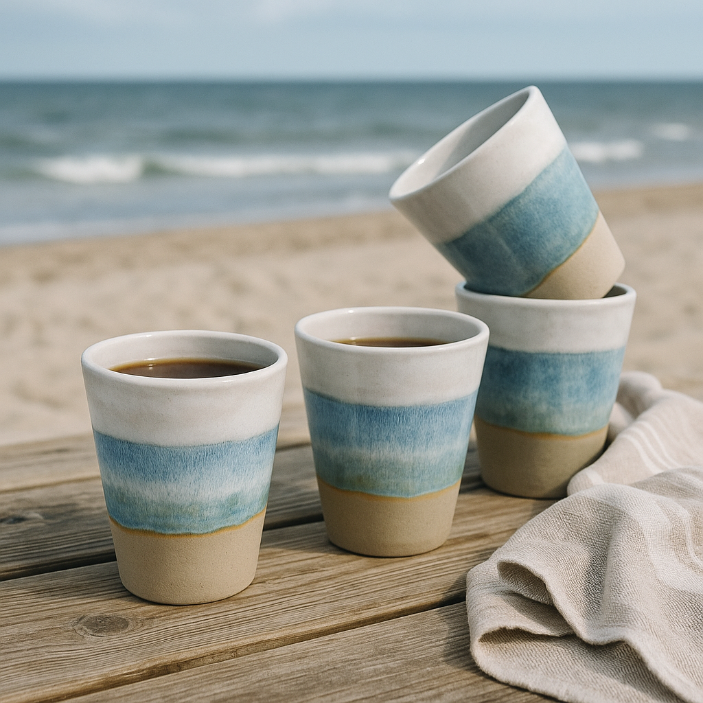 Denne kop er håndlavet i stentøj og glaseret med inspiration fra havets skiftende farver. Glasuren bevæger sig fra hvidt skum over blågrønne toner og ned til den rå, sandfarvede bund.