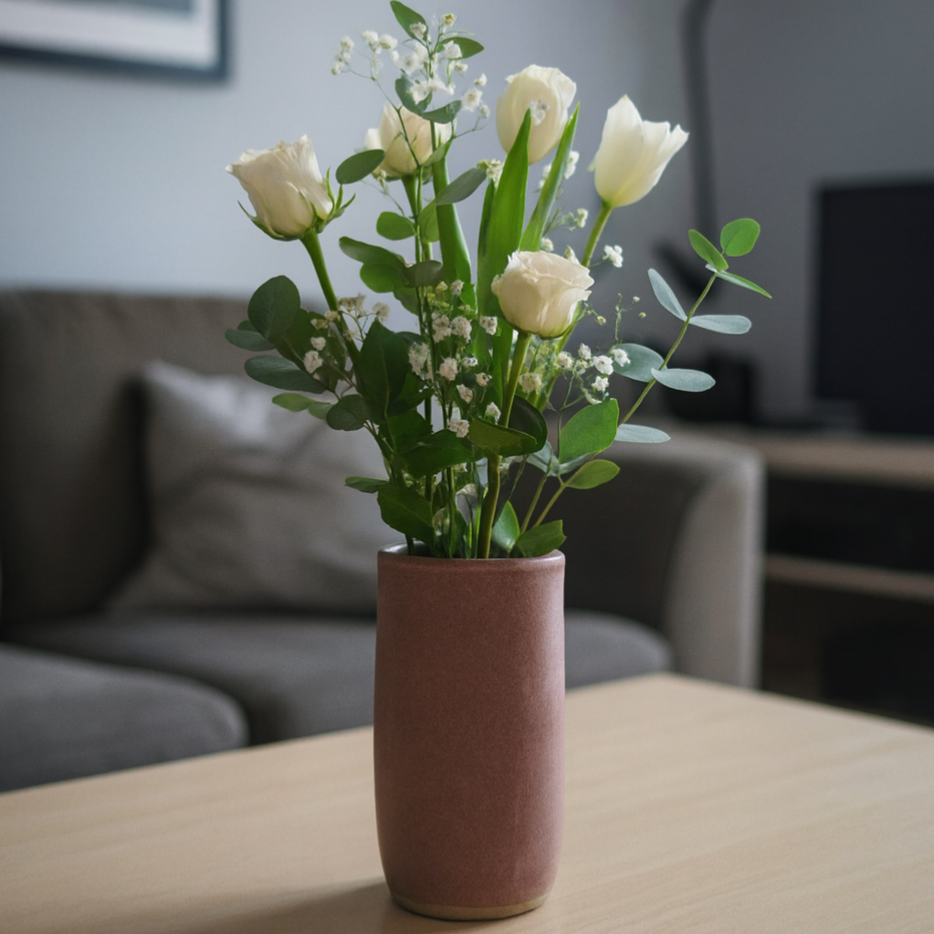 Denne lille vase i stentøj er håndlavet og glaseret i enten mat lyserød eller mat lys turkis. Begge farver har et roligt, støvet udtryk og en blød overflade, der spiller fint sammen med vasens enkle form.