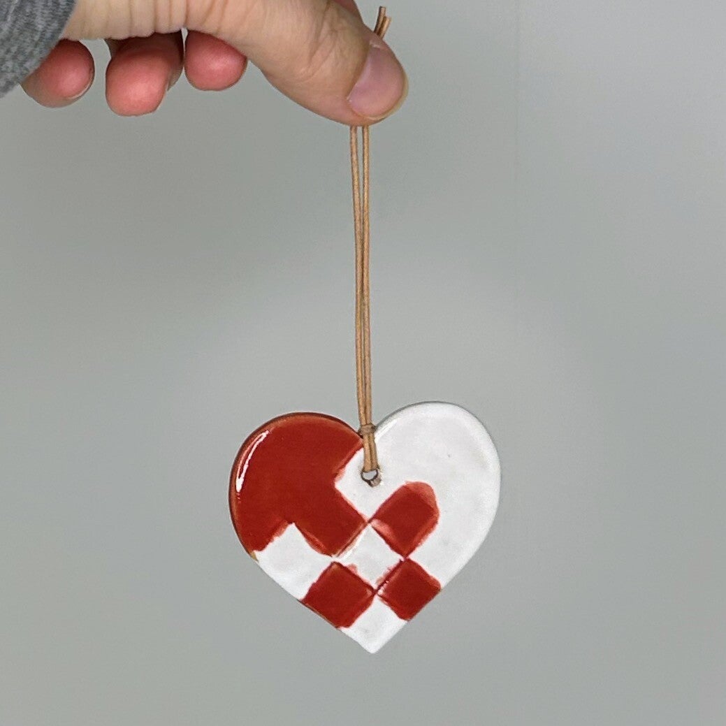 Håndlavede julehjerte-ornamenter i stentøj, hver med deres eget udtryk. Fås i tre varianter: klassisk hvid, dyb rød eller et flettet rød/hvidt mønster. Alle hjerter har en blank glasur og leveres med snor, klar til ophæng på juletræet, en gren eller som pynt på en gave.