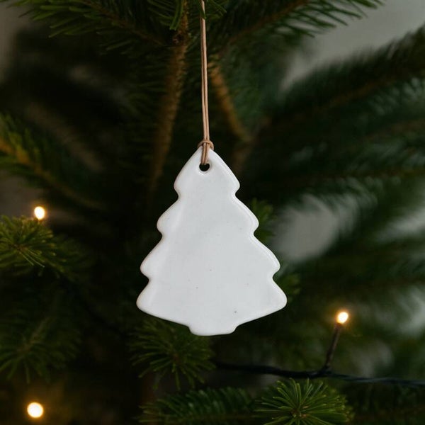 Håndlavede juletræsornamenter i stentøj, der fås i tre varianter: klassisk grøn, grøn med præget mønster og hvid med præget mønster. Glasuren er blank og giver et smukt spil i lyset, mens de forskellige strukturer gør hvert træ unikt.
